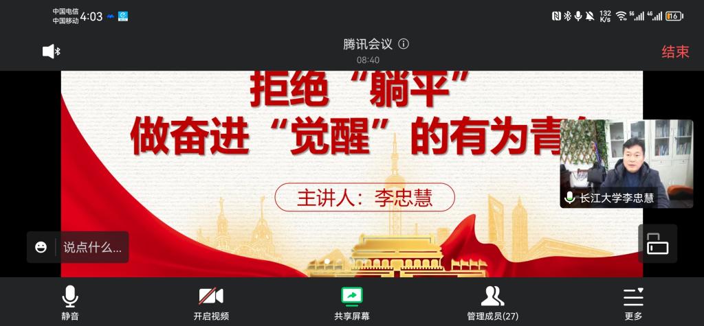 11月30日晚上,副院长李忠慧给油卓21901班学生讲授《拒绝躺平,做奋进觉醒的有为青年》主题党课。