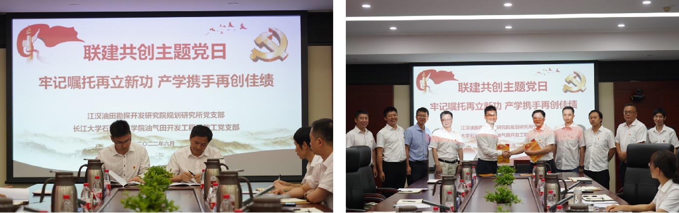 油气田开发系教工党支部与江汉油田勘探开发研究院规划研究所党支部联建共创启动会暨“牢记嘱托再立新功 产学携手再创佳绩”支部主题党日活动在江汉油田勘探开发研究院举行。研究院党委书记胡心玲、副院长荣焕青、院专家、联建支部党员代表,Bet365体育投注