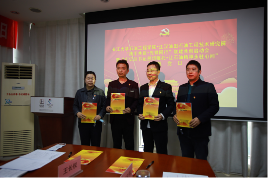 油气田开发工程系教工党支部书记王长权、油气井工程系教工党支部书记吴惠梅、研究生第一党支部书记史永波和江汉工程院储层改造党支部书记高东伟签订联建共创协议书,并依次作表态发言。
