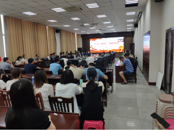 在石油科技大楼B113室召开全院教职工大会,院长江厚顺以“学习‘四史’ 汲取智慧”为题为全院教职工了讲授了一堂形势与政策课,在外出差教师在腾讯会议平台线上同步学习。