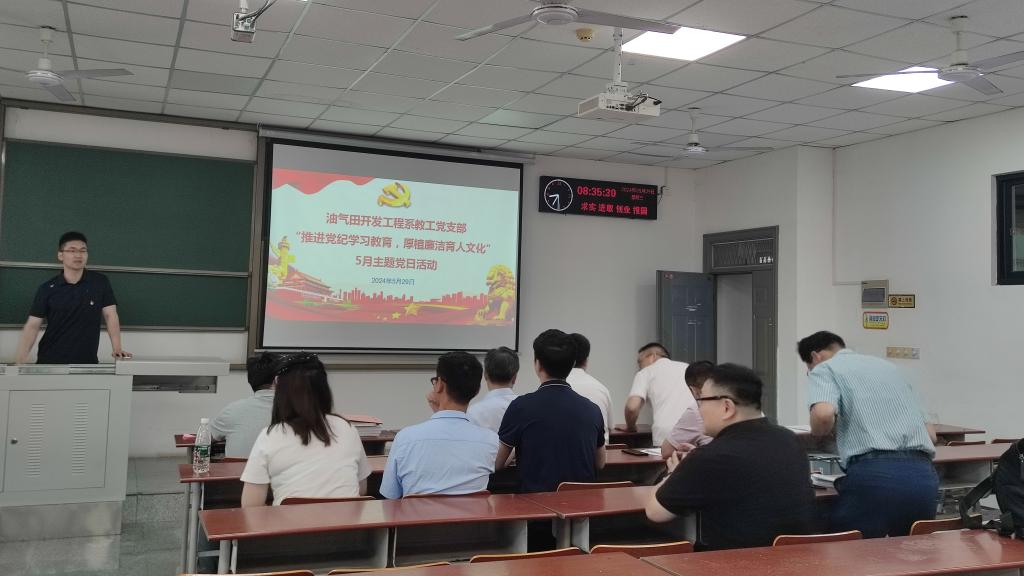 (通讯员:白振玮 许文俊)5月29日上午,油气田开发工程系教工党支部在武教A-509召开了“推进党纪学习教育,厚植廉洁育人文化”5月主题党日活动,由支部书记许文俊同志主持。