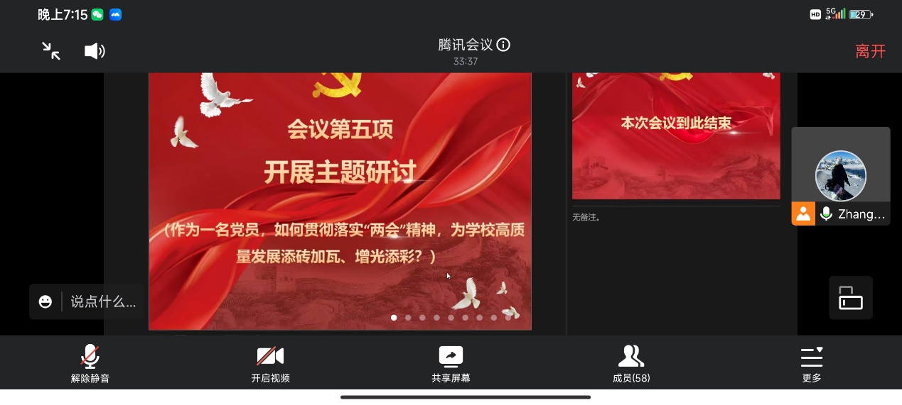 (通讯员 曾思佳)3月31日晚7时,研究生第二党支部线上开展3月主题党日活动,支部副书记张新龙同志主持,支部书记陈金建和全体党员同志参加。