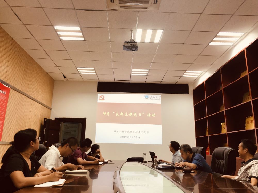 2019年9月29日下午,Bet365体育投注 机关教工党支部在石油科技大楼C111会议室开展了“不忘初心、牢记使命”为主题的9月“支部主题党日”活动,活动由党支部书记焦简金同志主持,党支部全体党员参加活动。