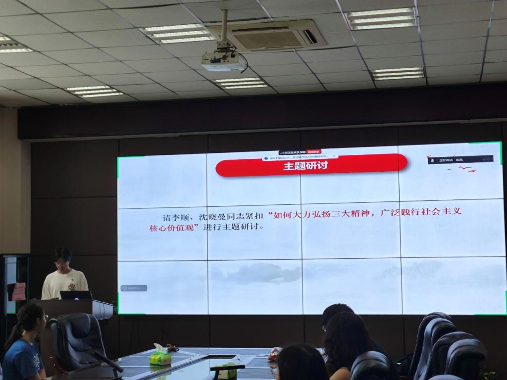 来到主题研讨环节,由李顺和沈晓曼同志紧扣“如何大力弘扬‘三大精神’,广泛践行社会主义核心价值观”进行主题研讨。他们从自身学习和工作角度出发,浅谈对“三大精神”的理解,例如在项目团队中,每个成员要相互配合,共同完成项目目标,这种团结协作的精神是带领我们走向成功的强大力量。无论是学习还是工作,环境时刻变化,新问题不断涌现,而“三大精神”是在党的不同历史时期形成的伟大精神,是社会主义核心价值观的生动体现,这些精神始终具有指导意义。