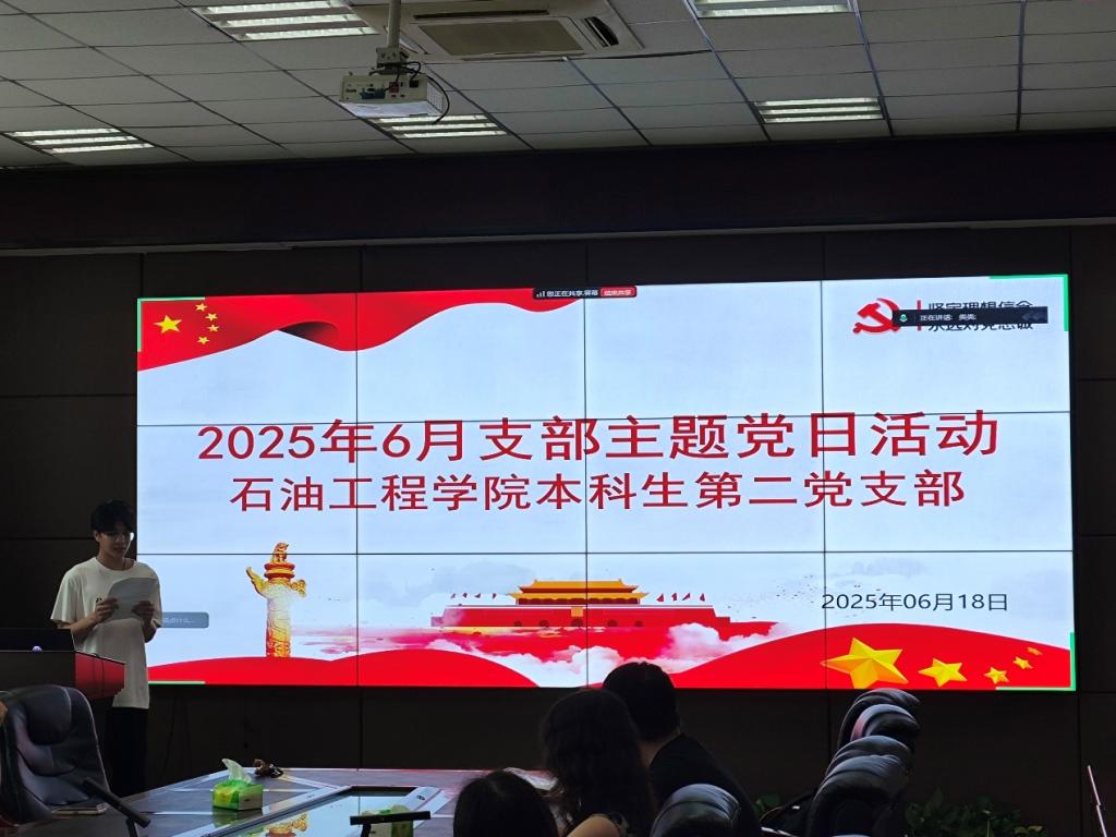 (通讯员 胡双双/文 叶佳惠/摄)2025年6月18日,本科生第二党支部在石油科技大楼B113开展六月主题党日活动,活动由郭灏贤同志主持,支部党员同志参加。