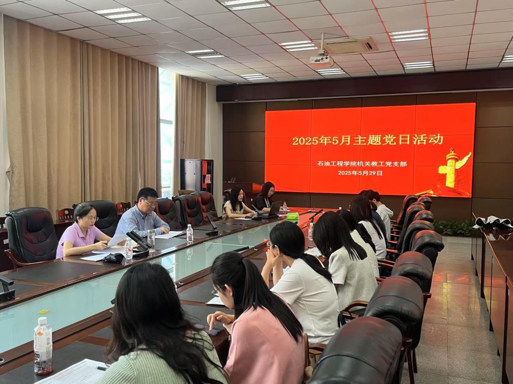 机关教工党支部于2025年5月29日14:30在石油科技大楼B113室召开五月主题党日活动。本次活动以“强担当 重实干 促融合”为主题,由党支部书记杨小玉同志主持,聚焦任务落实与问题破解,共谋Bet365体育投注