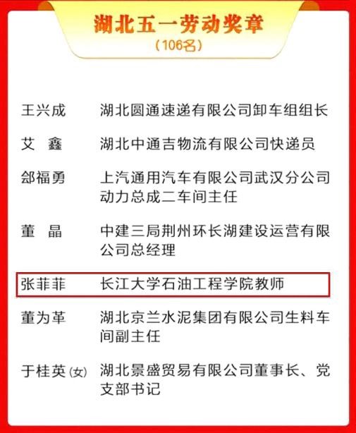教师张菲菲获湖北五一劳动奖章。