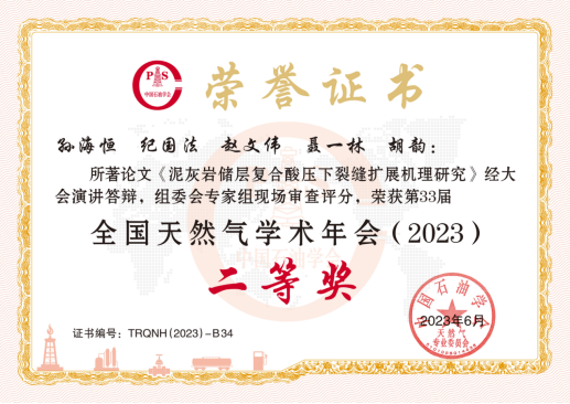 2020级硕士研究生孙海恒(导师:纪国法)在第33届全国天然气学术年会上荣获优秀论文二等奖。