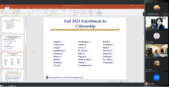 宣讲会上,Tulsa大学Vivian Wang副校长介绍了Tulsa大学基本情况,包括校区环境、奖学金政策、教学制度、师资力量、就业前景等同学们关心关切的学习和生活方面问题。随后,Tulsa大学Jun Lu博士详细介绍了该校的石油工程专业发展情况。Tulsa大学2015届博士毕业生,张菲菲副院长,进行了留学经验分享。“为什么要出国留学?”“为什么要选择Tulsa大学?”通过这两个问题,鼓励同学们选择出国留学,培养多元化的思维,获得不一样的人生感悟。