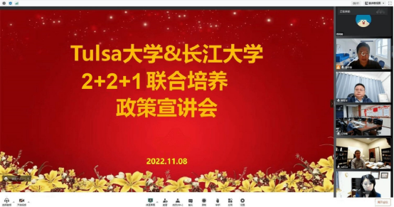 (通讯员 成雨音 周晓峰)11月8日晚9时,长江大学与美国Tulsa大学“2+2+1”联合培养项目线上宣讲会顺利举行,Tulsa大学全球事务副校长Vivian Wang、Jun Lu博士,我校国际交流与合作处处长曾亚军,Bet365体育投注