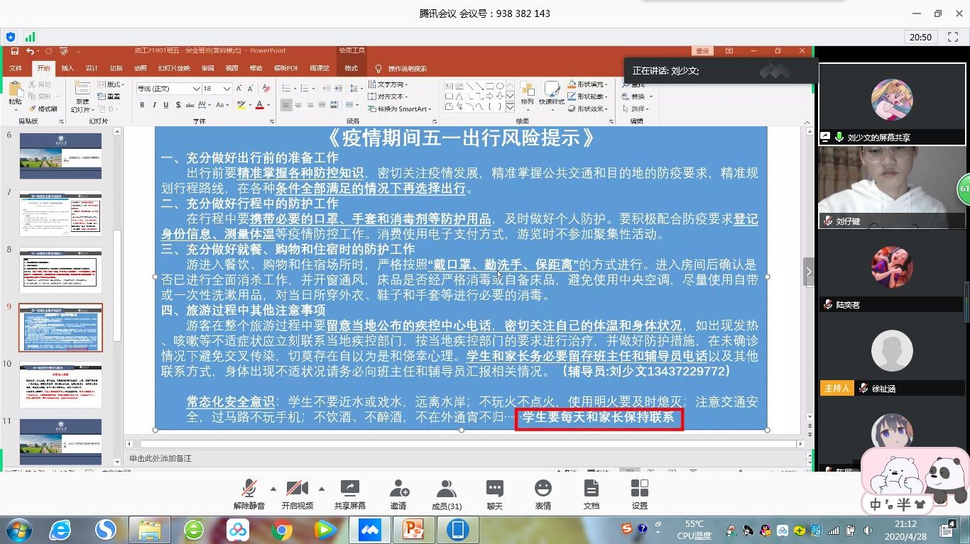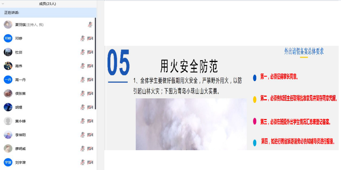 对学生假期以及日常学生工作常抓不懈,坚持学生在疫情期间每日上报疫情,坚持用辅导猫对学生进行定位打卡检查,坚持开展安全教育班会、播放安全教育视频,坚持每月对学生进行不同主题的安全教育,保持和增进与家长的练习,发挥家校平台作用,宣传政府和学校相关政策、安全常识、防疫知识和心理健康常识,权利保障疫情期间学生的生命安全和身心健康。