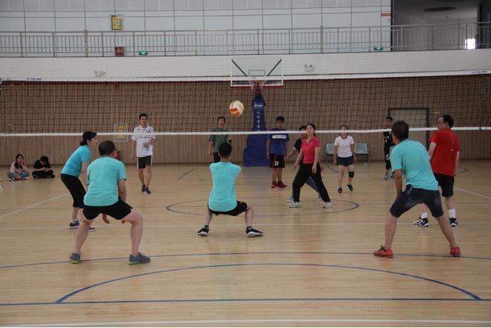运动无极限,操场上篮球赛进行得如火如荼,体育馆内的排球赛也是精彩万分。由沈伟正老师、史永波老师等人组成的教职工代表队和由毕业生组成的学生代表对展开了激烈的角逐。第一局比赛,教师队和学生队相继拿出看家本领,互不相让,最后以教师队一记漂亮的扣杀将比分定格在了25:22。第二局的比赛进行得十分焦灼,比分相持不下。比赛又一次达到赛点,此番仍是教师队领先,而学生队的扣球失误为对方送上一分,教师队再次取得第二局比赛的胜利。