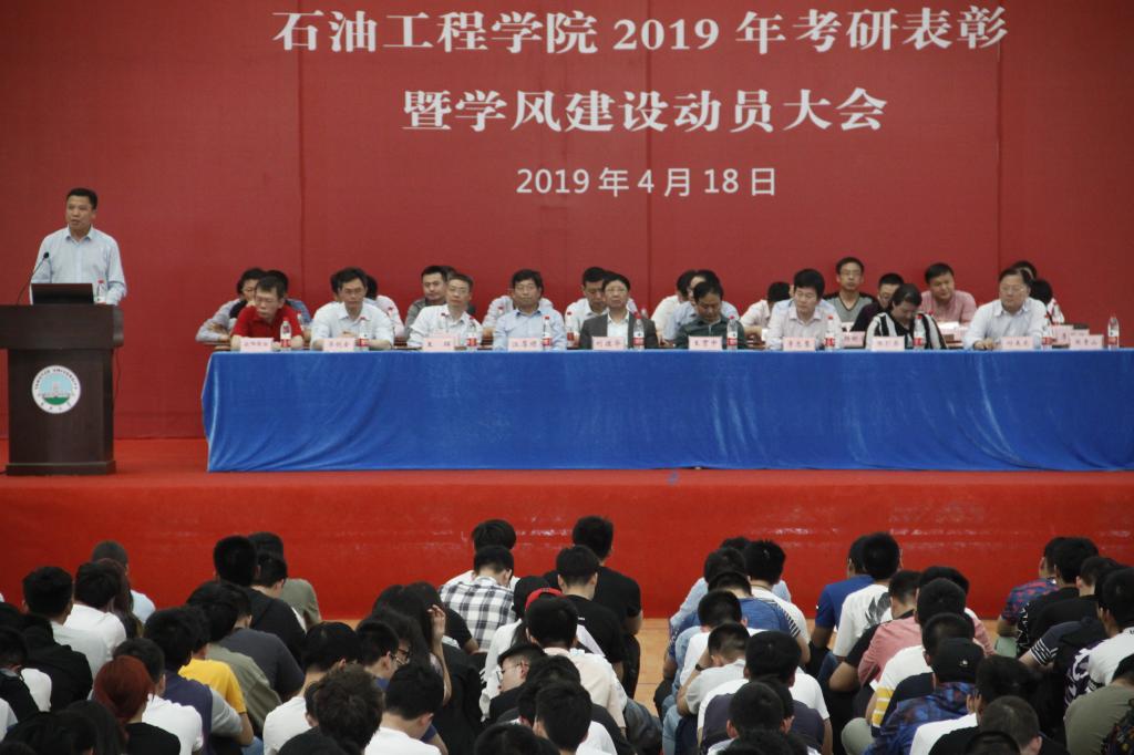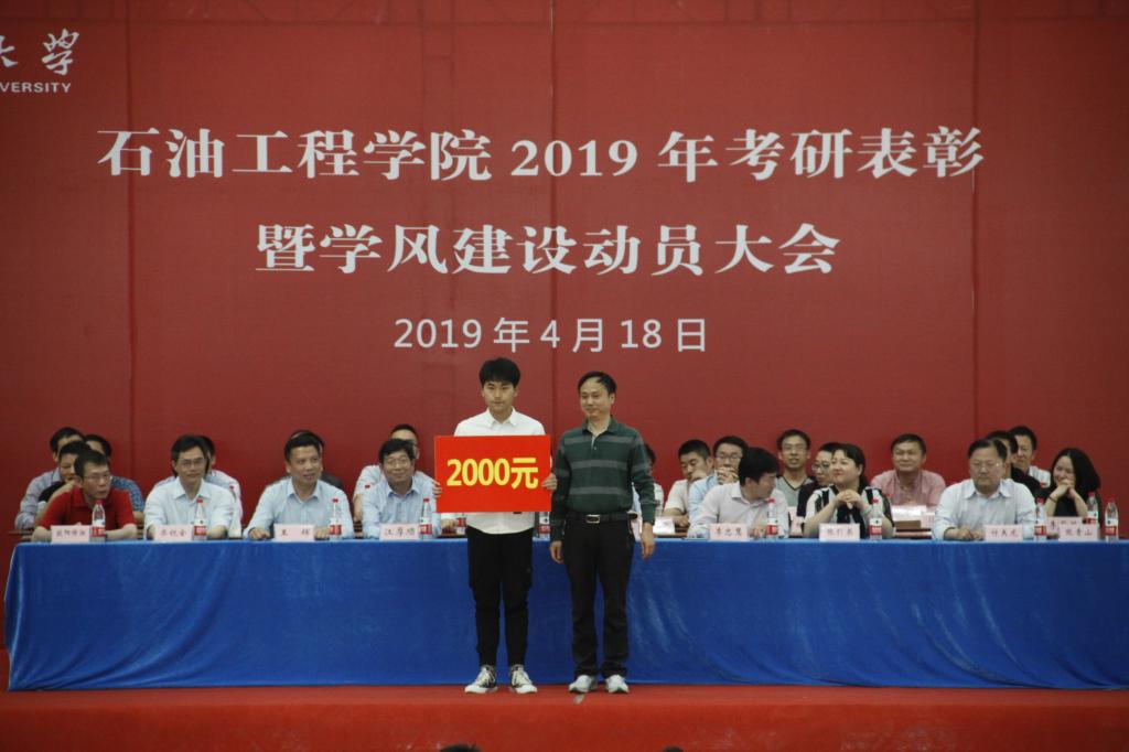 2019年考研表彰文件。在2019年全国研究生入学考试与复试中,有108名学生顺利通过初试和复试,被长江大学等18所学校或科研院所录取,其中石油之光21501班录取率为62%,华林公寓2#220和校内女寝4#547两个寝室更是取得“全员高中”的好成绩。随后,10位考研优秀学生代表和15位考研先进集体学生代表依次上台接受表彰并与颁奖领导合影留念。考研优秀学生代表、石油之光21501班朱清源(384分考取中国石油大学(北京))和储运21503班李伯英(354分考取长江大学)分享了他们大学学习生活经历和复习备考经验。