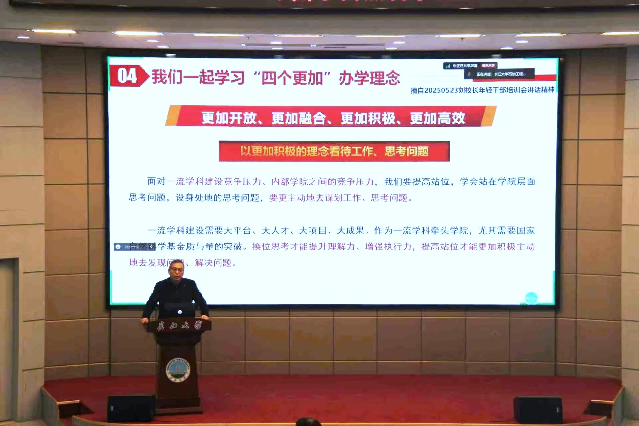 高度重视基金申报工作,将全力为科研人员提供全周期服务保障,希望老师们早启动、早筹备,精益求精打磨申报材料。最后,他带领老师们一起重新学习了“更加开放、更加融合、更加积极、更加高效”的办学理念,鼓励老师们要以更加开放的姿态汇聚资源,以更加融合的思维推动学科交叉,以更加积极的态度谋划科研选题,以更加高效的作风推进基金申报工作,切实将办学理念转化为科研实效。