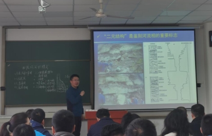 高达老师公开示范课分为两部分:一是他多年备赛参赛经验交流与分享,以“分享-探讨-进步”为主线,从长江大学青年教师教学竞赛细则入手,分享了自己的参赛经验;二是模拟比赛课程讲授,以《岩相古地理》曲流河沉积模式为参赛节段,进行了完整的赛程示范。高达博士的示范课深入浅出,将最新的科研成果融入课堂教学,授课过程采用PPT与板书结合,既有文字表达、又有图片和视频播放,使得整个教学过程生动有趣,通过现场积极与学生互动,让学生对该课程产生了浓厚的兴趣。最后高达博士的讲课在热烈的掌声中落下帷幕,吸引了Bet365体育官网
