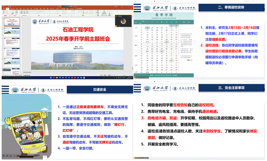 (通讯员 洪一帆)新学期伊始,为切实保障学生平安、有序返校,进一步强化学生的安全责任意识,2025年2月12日,全院研究生以班级为单位,通过线上会议形式召开“安全返校,平安启程”主题安全教育班会。