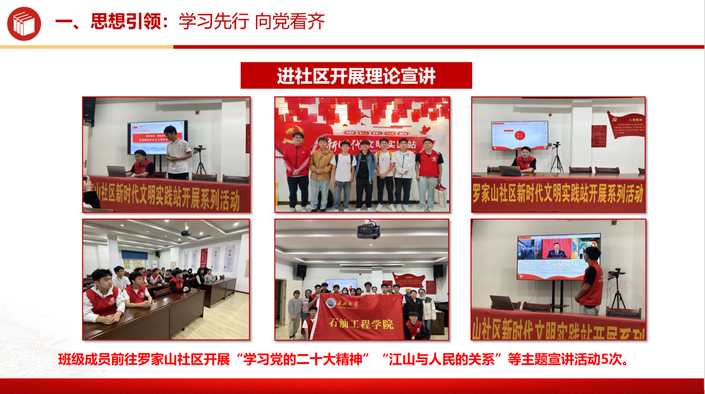 组织的“时光加油站”与“石油文化素养讲坛”等活动,并深入学习党的二十大精神。通过这些活动,班级成员的思想觉悟得到了显著提升,实现了100%的青年大学习的完成率。此外,累计推优入党积极分子15人,发展预备党员1人、党员1人。充分展现了我们在思想建设方面的成果。