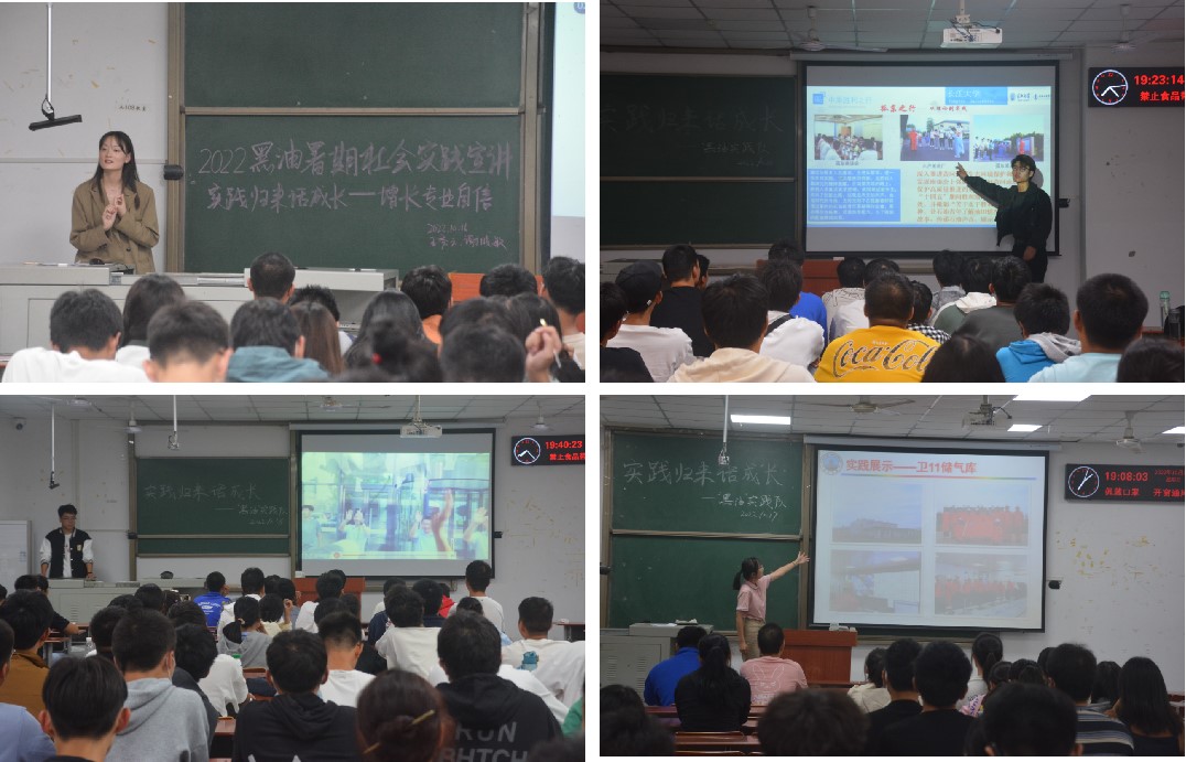 举办石油文化素养讲坛第三场,“黑油”暑期社会实践队开展“实践归来话成长”主题分享会,在五个会场同步开展,辅导员史永波、周晓峰、全体2022级本科生参加。