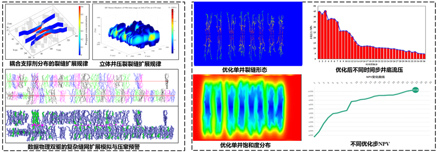 创建了立体/暂堵压裂以及闪电击穿理论的非常规压裂裂缝扩展模拟方法,形成了全耦合的压-闷-采全周期复杂缝网流动模拟方法,耦合人工智能算法实现了非常规压窜预警与防窜智能优化及井网、缝网、压裂施工参数及控压生产制度等地质工程一体化智能优化。